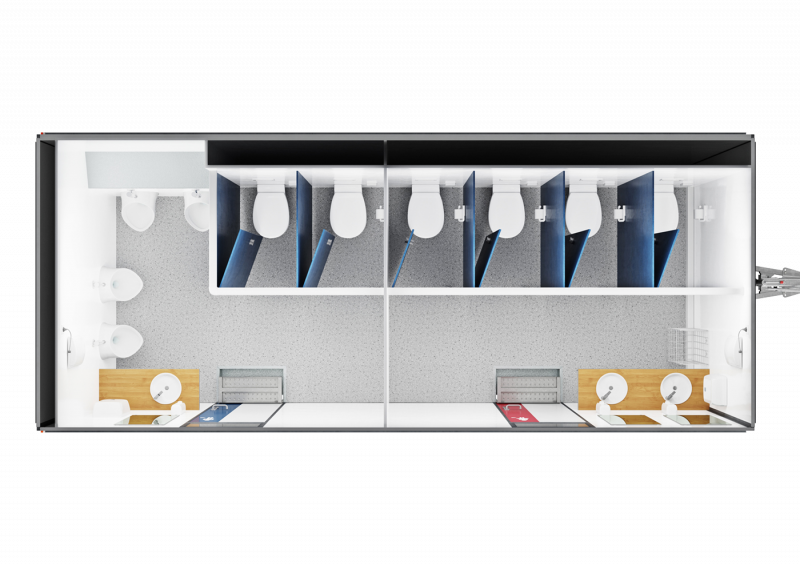 The TOI® ECO Sanitary Trailer XL offers that bit extra: it impresses with its generous interior design – and exceptional flexibility. Thanks to its variable dividing wall, the number of toilet cubicles in the ladies’ area can be increased if necessary.